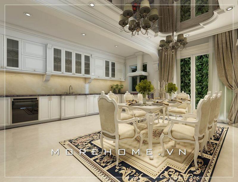 Không gian ẩm thực của ngôi nhà với phòng bếp liền phòng ăn theo phong cách tân cổ điển có lược bỏ bớt các chi tiết trang trí cầu kì, nội thất màu trắng tinh tế tạo sự trẻ trung.