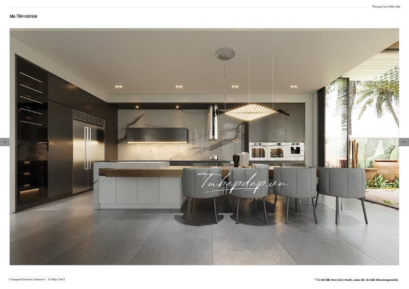 Nội thất phòng bếp nhà phố hiện đại với tủ bếp chữ i gỗ Acrylic màu xám