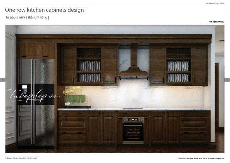 Chỉ với 1 hàng đường thẳng duy nhất, các kiến trúc sư MoreHome thiết kế hệ thống tủ bếp tiện nghi từ gỗ tự nhiên kiểu tân cổ điển đã giúp căn bếp tiện nghi hơn