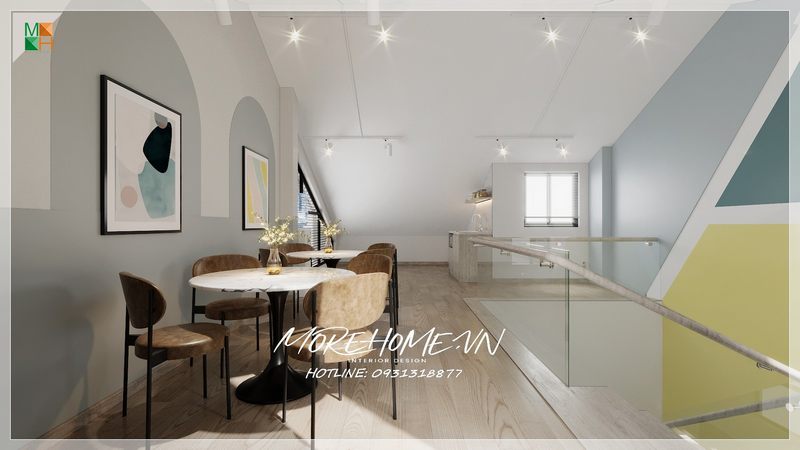 Tận dụng không gian không cần quá lớn với thiết kế nội thất cách sắp xếp hợp lí đã mang tới không gian nhà ăn văn phòng phù hợp đáp ứng được nhu cầu và đem lại sự tiện lợi cho nhân viên cho quá trình ăn uống nghỉ ngơi