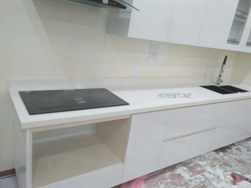 Phòng bếp sử dụng đá ốp lát bằng đá nhân tạo vân mây trắng vừa giúp không gian bếp thêm trẻ trung hiện đại vừa dễ dàng lau chùi vệ sinh hàng ngày