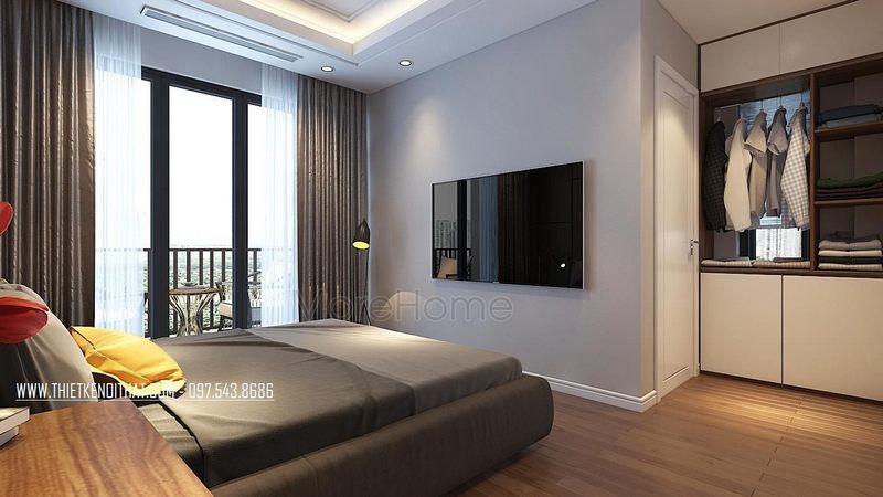 Thiết kế phòng ngủ hiện đại đơn giản, mọi đồ đạc đều được bố trí gọn gàng, vuông vắn đem lại sự rộng rãi thoáng đãng cho không gian của căn hộ chung cư