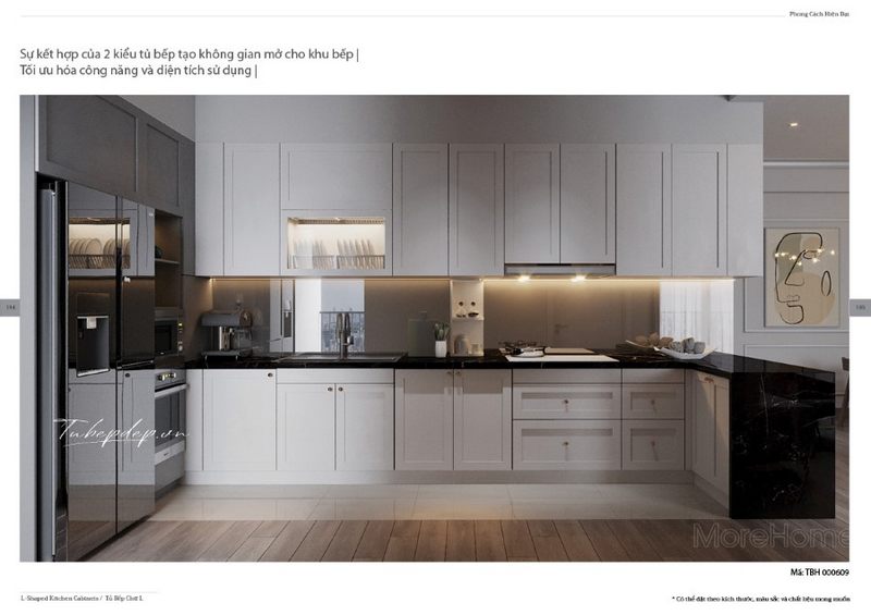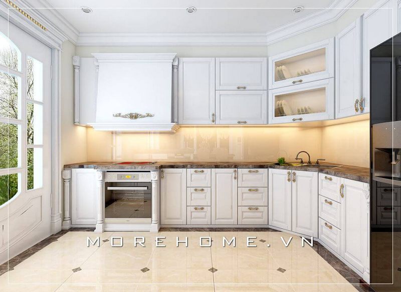 Mẫu tủ bếp gỗ tự nhiên sơn trắng được thiết kế kiểu dáng chữ L, họa tiết chạm khắc tân cổ điển kết hợp thiết bị phòng bếp hiện đại tạo nên sự sang trọng, tinh tế và tiện nghi cho người nội trợ.