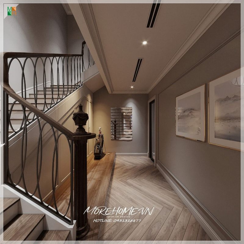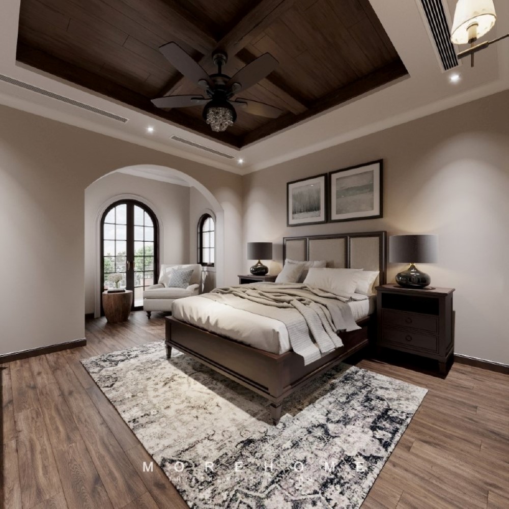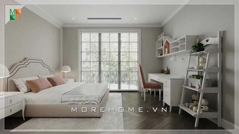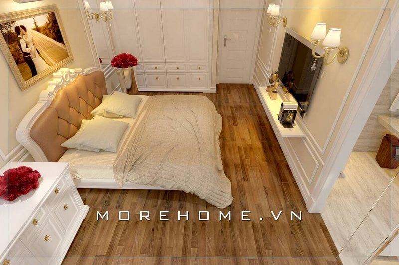 Trong mẫu thiết kế nội thất phòng ngủ biệt thự này, Morehome thiết kế táp đầu giường tủ đầu giường gỗ óc chó kiểu dáng tân cổ điển nhẹ nhàng, phù hợp với chiếc giường ngủ gỗ tân cổ điển đơn giản sang trọng.