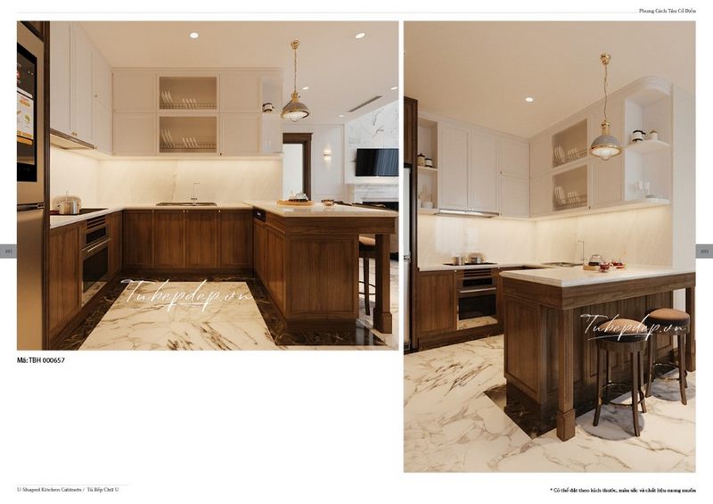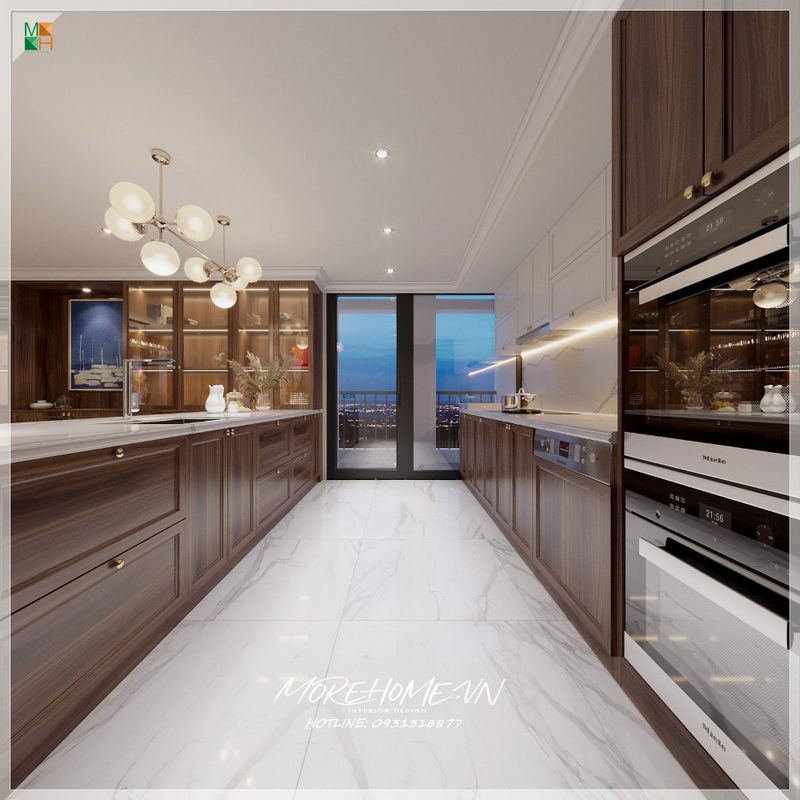 Mẫu phòng bếp tân cổ điển từ gỗ óc chó cao cấp được tối giản nhiều chi tiết tạo sự thoáng đãng và tiện nghi hơn, phù hợp cho cả biệt thự, nhà phố và chung cư cao cấp.
