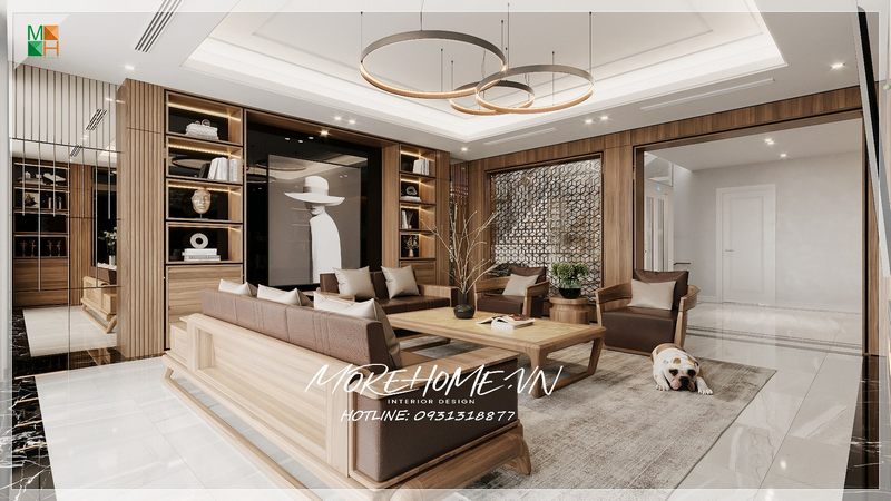 Thiết kế không gian phòng khách biệt thự gỗ óc chó mang đến sự sang trọng, đẳng cấp cho không gian sống của gia đình.