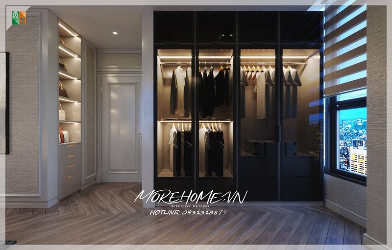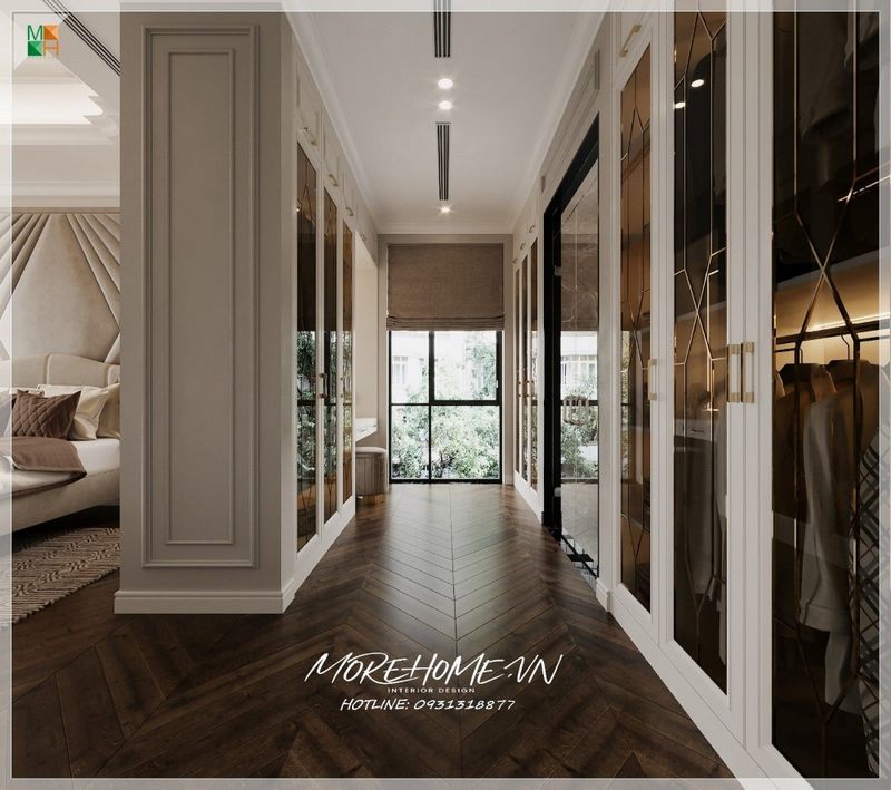 Mẫu thiết kế phòng thay đồ liền phòng ngủ, với hệ thống tủ quần áo cánh kính kịch trần lớn giúp bạn có rất nhiều không gian để lưu trữ đồ dùng