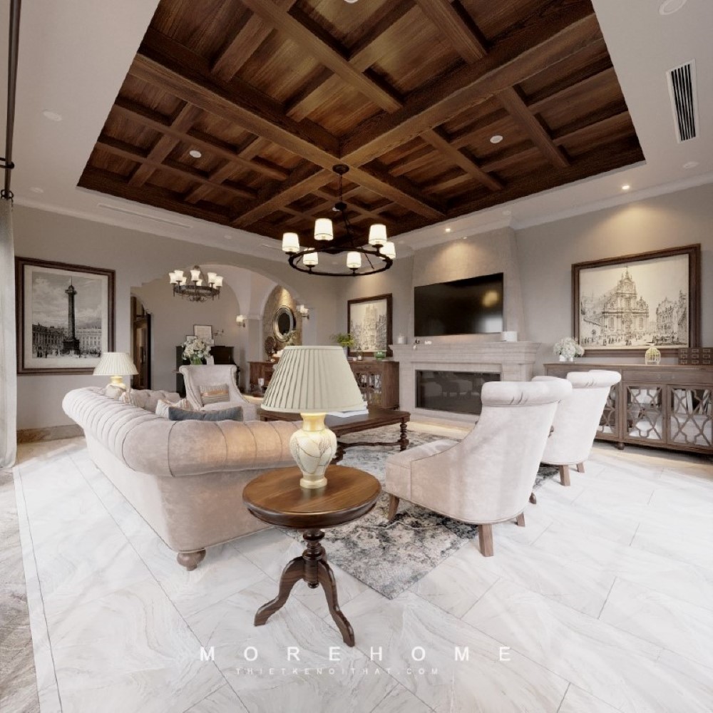 Thiết kế nội thất cho phòng khách biệt thự cao cấp có phong cách tân cổ điển đậm chất ấn tượng với những đường nét sống động và chi tiết tinh tế.